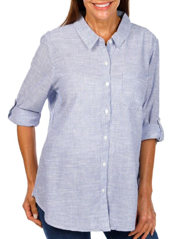 Lightweight and stylish, this button down top features 3/4 sleeves with roll tabs for adjustable comfort. Designed for easy layering and breathable wear it offers a relaxed fit perfect for work weekends or travel. A versatile piece that blends casual ease with polished detail. Fabrication is 100% cotton.