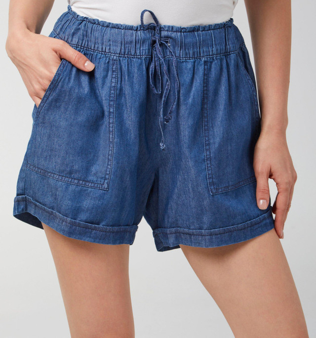 Introducing our Women's 5-inch Pork Chop Pocket Shorts, crafted from a blend of viscose and cotton. These stylish shorts feature a denim exterior, a comfortable drawstring waistband, and distinctive pork chop pockets. The roll cuff hem adds a casual touch, making them perfect for any summer outing. Embrace effortless style and practicality with these versatile shorts. Fabrication is 60% cotton, 40% viscose.