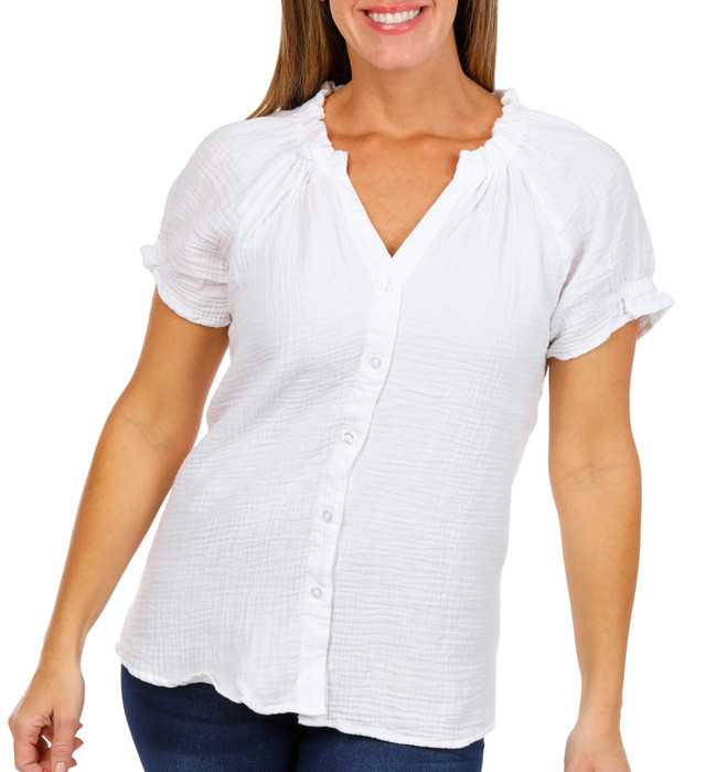 This Short Sleeve Button Down Gauze Top offers a breezy, lightweight feel in a solid color. Finished with short puff sleeves for a soft, feminine touch, its an easy, stylish choice for warmweather dressing. Top length measures approximately 25 inches. Fabrication 100% cotton