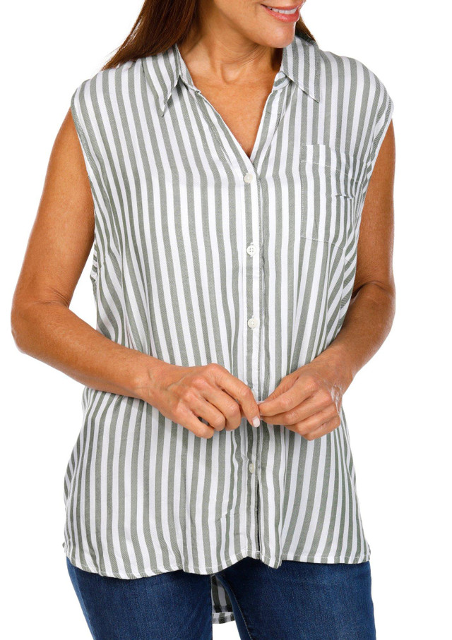 Stay cool and polished in this sleeveless womens top featuring a relaxed collar and button down front. Made with soft lightweight fabric it offers breathable comfort and effortless style. Perfect for warm days or layered looks this versatile top adds a refined touch to any outfit. Fabrication is 100% rayon.