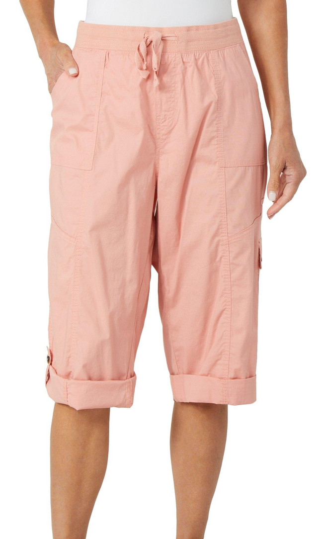 Effortlessly stylish and functional, the Women's Suzanne Capris feature a comfy drawstring pull-on waistband, front, back, and cargo pockets for all your essentials, plus adjustable leg rolls for versatile wear. With a 15-inch inseam, these capris are perfect for everyday comfort and casual flair. Fabrication is 98% cotton and 2% spandex.