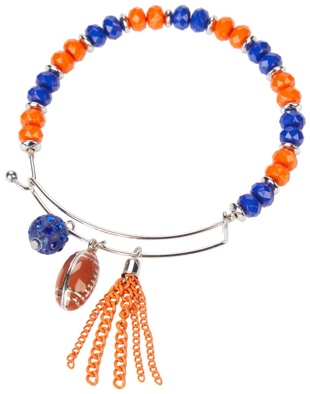 Celebrate your team pride with this UF Gators bangle charm bracelet. Featuring blue and orange beads with football themed charms, this bracelet adds a spirited and stylish touch to any outfit. Its sleek bangle design makes it easy to wear for game day or everyday flair.