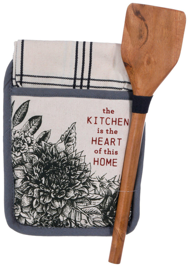 Introducing our 3 Pc Floral Hot Pad & Towel with Spatula Set. Crafted from 100% cotton, this kitchen towel is both soft and durable. The hot pad is also crafted from 100% cotton, with polyester fill, to bring both protection and style to your kitchen. The wooden spatula is perfect for stirring your favorite pot of soup. Measureas approximately Hot Pad: 7 in x 7 in, Spatula 12 in.