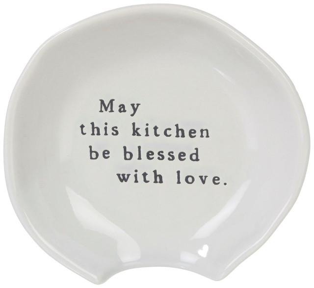Add warmth to your countertop with the 4.5 in Kitchen Blessings Ceramic Spoon Rest. Featuring white ceramic with black lettering that reads May this kitchen be blessed with love, it offers both function and inspiration. Ideal for daily cooking or as a thoughtful gift. Fabrication is 100% ceramic. Measures approximately 1 in x 4.5 in round.