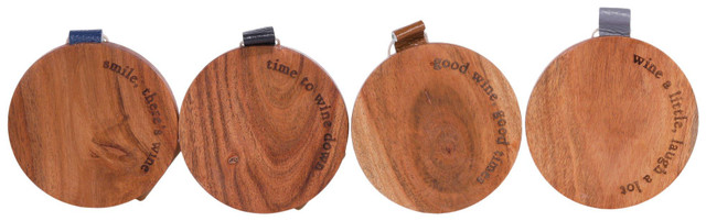 Introducing the 4 Pk Wood Wine Coasters, each measuring 4 inches round. These charming coasters feature unique quotes about wine, adding a touch of personality to your gatherings. Crafted from high-quality wood, they provide a stylish and practical solution for protecting your surfaces. Perfect for wine enthusiasts, these coasters are a delightful addition to any home bar or dining area, making every sip a bit more special.