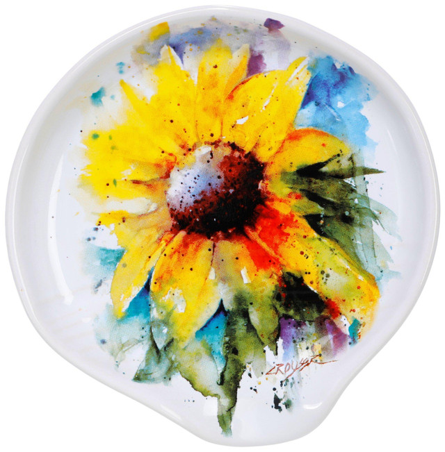 Bring a touch of nature to your kitchen with the 5 in Sunflower Ceramic Spoon Rest. Featuring a delicate watercolor style sunflower design, it adds charm while keeping counters clean during meal prep. Ideal for everyday use or seasonal displays. Fabrication is 100% ceramic. Measures approximately 1 in x 5 in round.