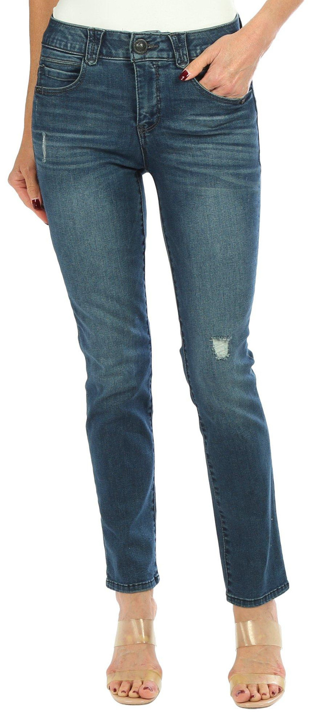 These jeans feature a solid color design on lightweight stretch denim fabric, a stretch waistband, built-in Ab-technology, one-button and zipper closure, five pocket styling, and subtle distressing. The inseam measures approximately 28 in. Fabrication 54% cotton, 25% rayon, 18% polyester, 1% spandex.