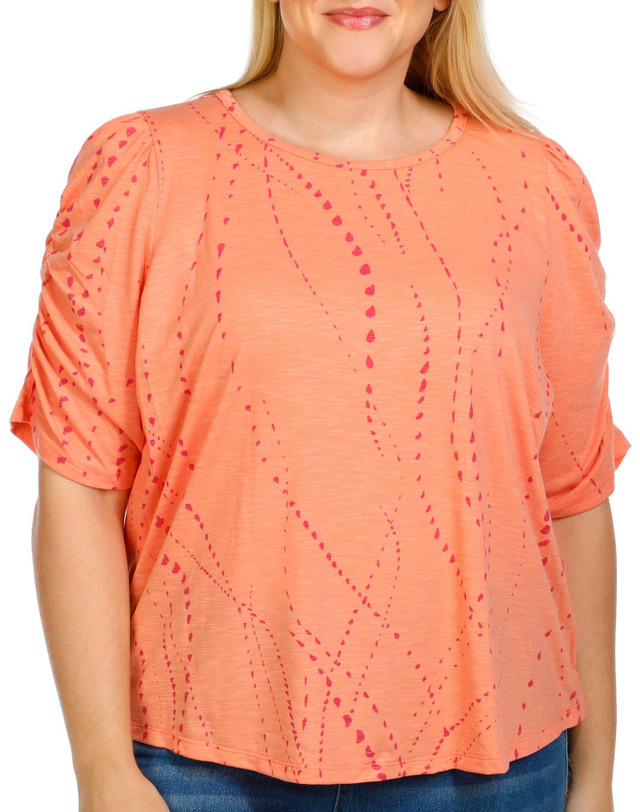 This Plus Short Sleeve Blouson Dotted Top brings soft elegance with its round front neckline and back keyhole detail. The dotted fabric and gently gathered sleeves add a graceful touch perfect for both casual and dressy looks. Fabrication 67% polyester, 30% rayon, 3% spandex.