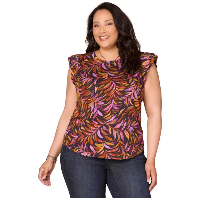 This plus-size knit top is a closet staple that suits every occasion. Designed with double ruffle cap sleeves, a classic crew neck, and an eye-catching leafy abstract print, youll be reaching for this style again and again. Fabrication 60% cotton, 40% modal