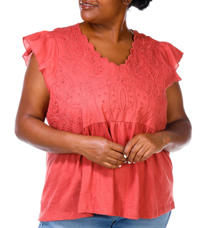 This top features a deep v-neck and an empire waist for a flattering shape. Embroidered decorations add elegant detail to the neckline. Fluttery cap sleeves provide a soft, feminine touch. The design offers comfort and style for everyday wear.