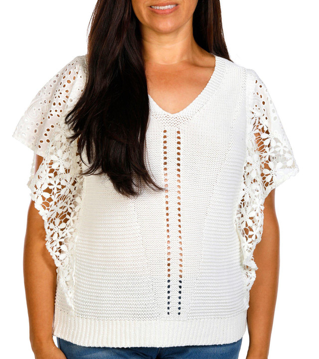 This plus size top features a soft solid knit exterior with a flattering v neckline. Flutter sleeves with eyelet detail and an open crochet design add a breezy and feminine touch, perfect for warm weather styling.