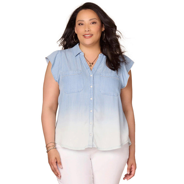 Top off your fave denim with this cap-sleeve shirt. Features point collar, front button closures, hits at hips, chest patch pockets, flutter sleeves. 100% Lyocell. Machine washable.
