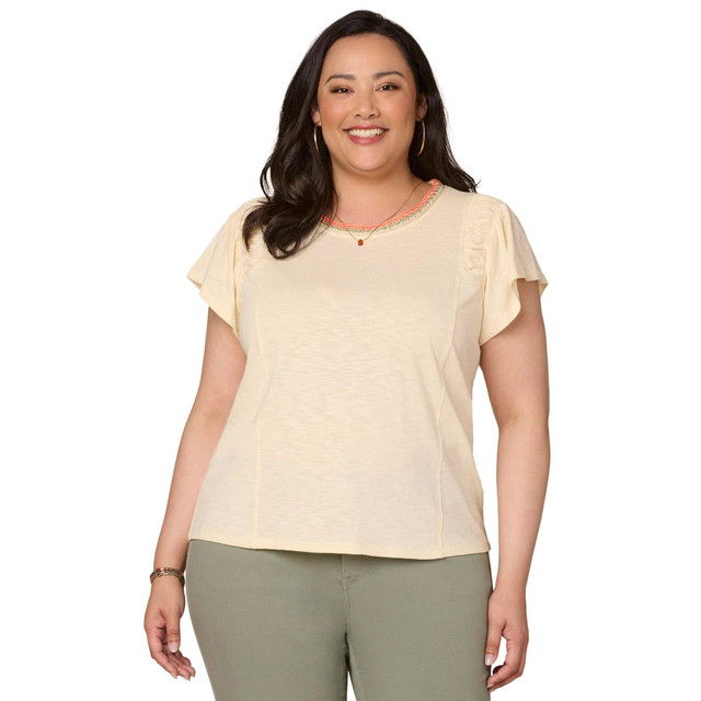 Give your everyday wardrobe a refresh with this must-have staple knit tee in plus sizing. Its designed with short sleeves, ruched armholes, an intricate crochet scoop neck, seaming details, and a slightly sheer fabric. 60% cotton, 40% modal. Front length approx. 27 1/2 in. Back length approx. 26 1/4 in.