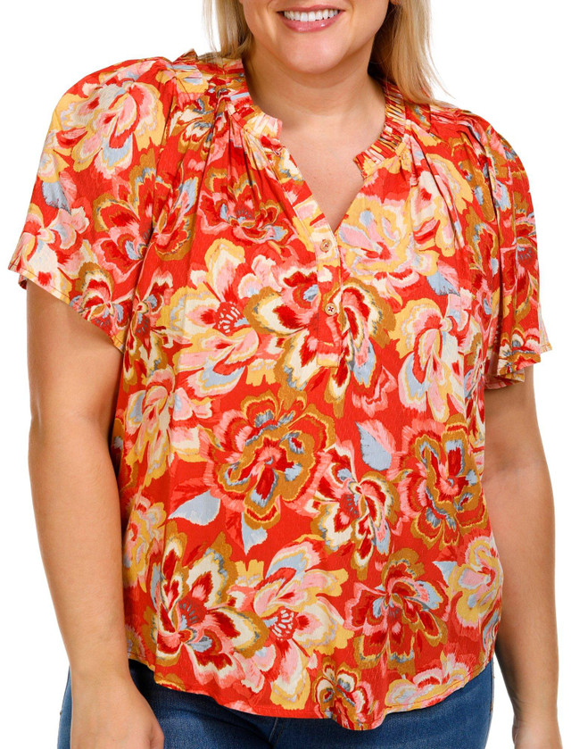 With this flowing floral printed woven top, springtime is wherever you are. Feminine accents, like a ruffle edge V-neck, half button down placket, and short sleeves with ruffle shoulders, elevate and effortlessly polish your outfit. Top length measures approximately 24 inches.