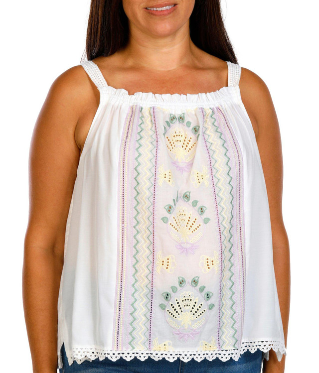 Whether you are layering up or getting some sun on your shoulders, this pretty woven tank is a must-have for this season and beyond. Designed with wide straps, a ruched square neckline, intricate embroidery, and a scallop hem, it is a style you will want to stock up on in every color.