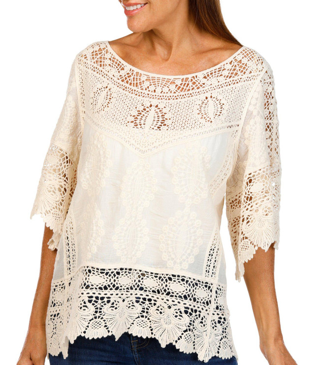 Feminine and breezy, this Womens 3/4 Sleeve Crochet Flare Top features a solid color and intricate crochet design. Scalloped trim on the sleeves adds a delicate touch, making it perfect for warm-weather days or layering with your favorite pieces. Fabrication 100% cotton.
