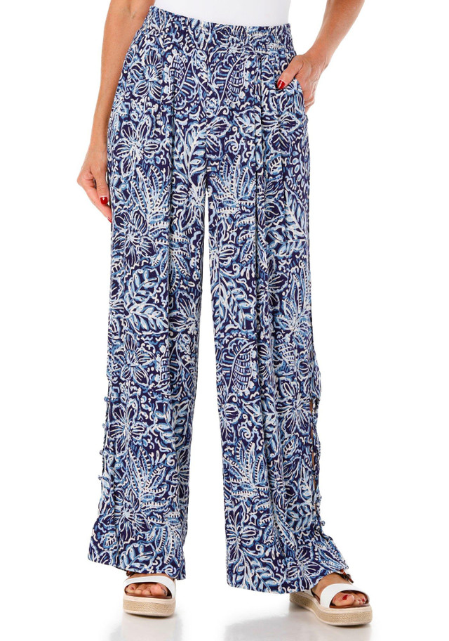 Step out in effortless style with our Women's Skyrise Wide Leg Print Pants. Featuring a bold, stylish print, elastic waistband, and side seam pockets, these wide-leg pants offer comfort and flair. Fabrication 100% rayon