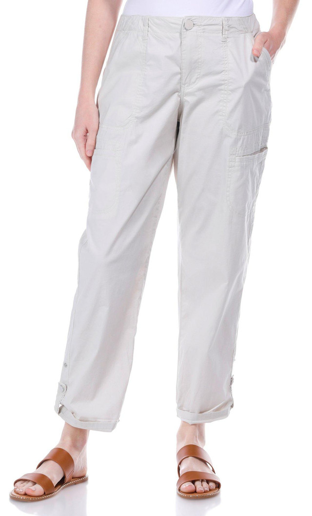 These stylish utility pants are exactly what your wardrobe needs to keep the adventure going! They feature a stylish solid color, button and zipper fly closure, buttoned roll-cuff hems, double front and rear pockets, and 2 additional utility pockets to keep your belongings safe on the go! Inseam measures approximately 25 in. Fabrication is 98% cotton and 2% spandex.