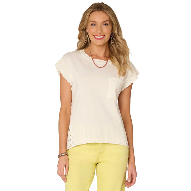 This cozy sweater top delivers texture from every. With extended cap sleeves, a round neck, scalloped edge detailing, an open-work crochet back, it mixes laid-back comfort with visual interest. Self: 80% cotton, 20% nylon. Contrast: 64% cotton, 36% acrylic.