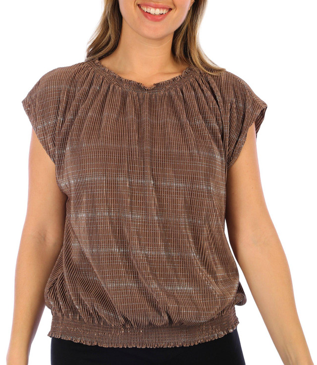 Whether youre meeting up with friends or heading to the office, this metallic knit top is the perfect centerpiece for you outfit. Its extended cap sleeves, smocked crew neck, stripe print, and smocked hem add effortless style points to your look. Top length measures approximately 22 in.