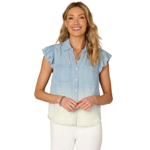 Go for an all-out classic look with a twist. This timeless button down woven shirt is dressed up with flutter cap sleeves, breast pockets, a clean collar, and scallop edge detailing. Fabrication: 100% lyocell.