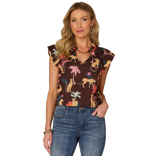 Made from lightweight woven fabric, this chic top is designed with a tropical cheetah print with flutter sleeves and a ruffle split neck. It has a relaxed, flowy fit for easy styling from day to night. Fabrication: 50% cotton, 50% rayon.