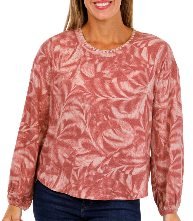 Add a touch of feminine charm with the Womens Long Sleeve Floral Embroidered Neck Top. Featuring delicate embroidery around the scoop neckline and a vibrant tropical floral print, this soft, flowy top combines comfort and style. Subtle puff sleeves create an effortless, flattering look perfect for casual wear, work, or weekend outings. Fabrication is 68% polyester, 27% rayon, 5% spandex. Length measures approximately 25 in.