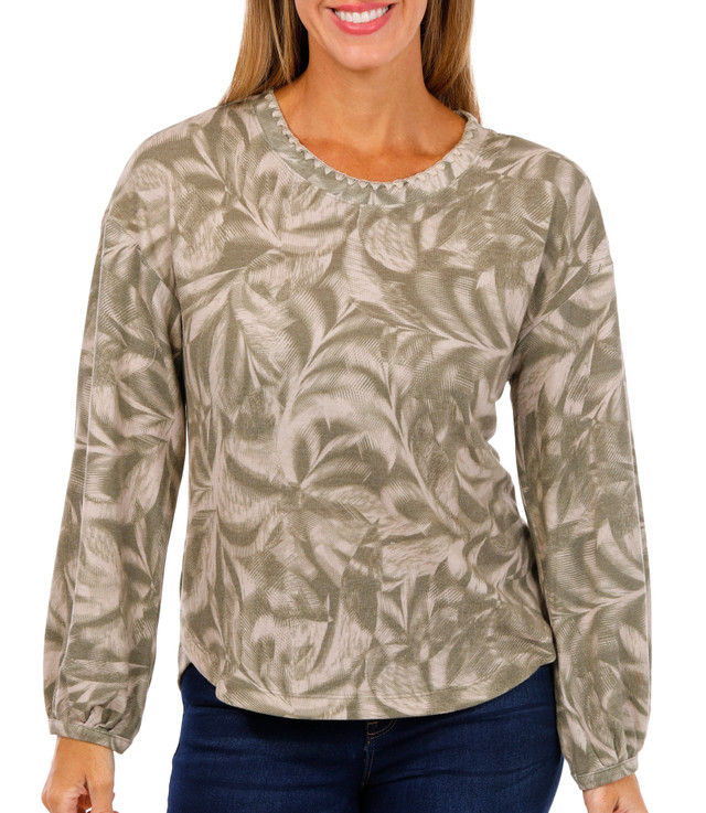 Add a touch of feminine charm with the Womens Long Sleeve Floral Embroidered Neck Top. Featuring delicate embroidery around the scoop neckline and a vibrant tropical floral print, this soft, flowy top combines comfort and style. Subtle puff sleeves create an effortless, flattering look perfect for casual wear, work, or weekend outings. Fabrication is 68% polyester, 27% rayon, 5% spandex. Length measures approximately 25 in.