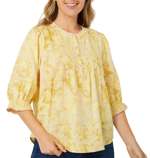 This womens top features a subtle print with elbow length lantern sleeves for a graceful silhouette. The pleated detail on the quarter button down split neckline adds texture and charm making it a stylish choice for any casual or semi dressy occasion. Fabrication is 100% polyester.