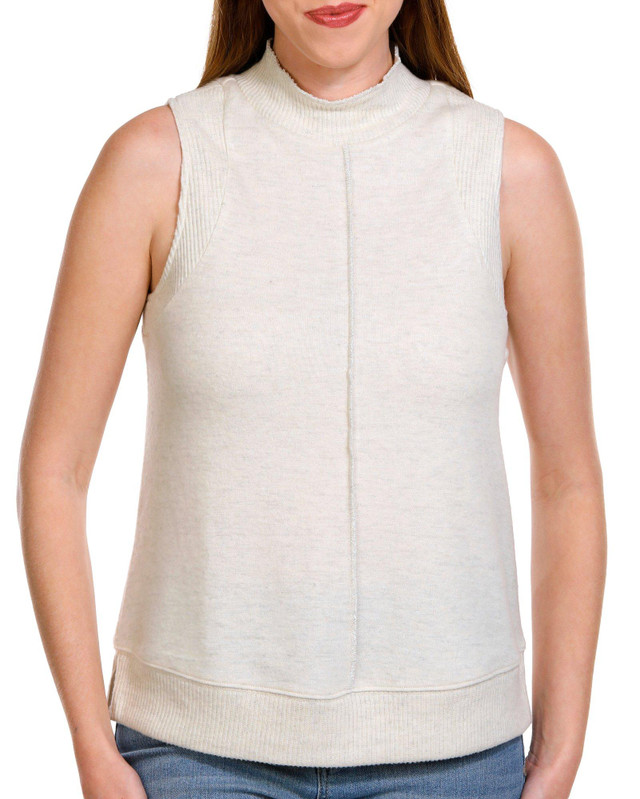 From holiday parties to just-because days, this mixed media knit top has your back. Shine bright with metallic exposed seaming and find comfort in its mock neck and easy, relaxed A line shape with slits at the hem. Fabrication is 73% polyester, 24% rayon, 3% spandex.