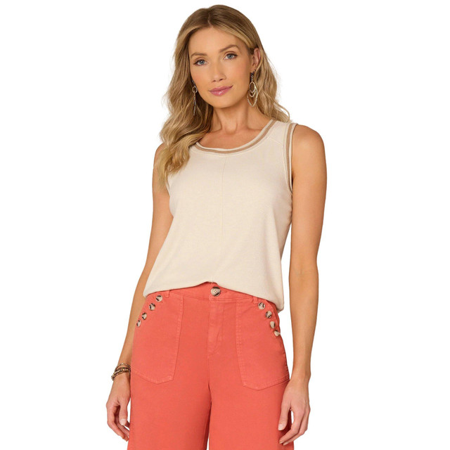 Its easy to add this knit tank top to your regular rotation, designed with a curled scoop neck, novelty knit bands, and a surplus shirttail hem. Fabrication is 65% polyester, 27% rayon, and 8% spandex.