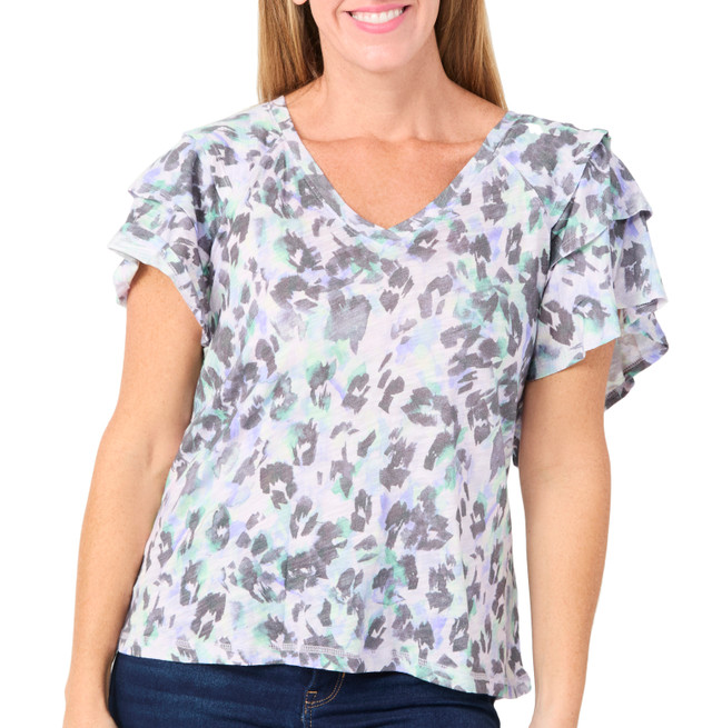 Artful design meets soft structure in the Womens Tier Bell Sleeve V-Neck Abstract Print Top. Styled with tiered bell sleeves and a flattering V-neckline, it features an abstract print in grey and aqua on a white background for a refined modern look. Ideal for both casual days and polished occasions. Machine wash line dry. Fabrication is 60% cotton 40% modal. Length measures approximately 25 in.