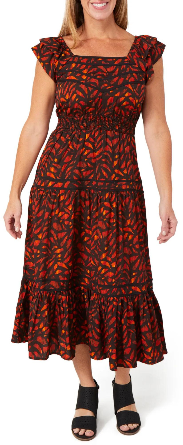 Effortlessly elegant, the Women's Tiered Print Midi Dress features a flattering square neckline, short sleeves, and a playful ruffle hem. Its tiered design adds movement and charm, making it perfect for both casual outings and special occasions.