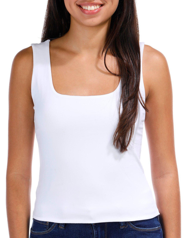 Add a touch of sophistication to your wardrobe with this Juniors Double Layer Square Neck Tank Top. Crafted from double layer fabric, it offers a luxurious feel and a flattering fit. The elegant square neckline adds a modern twist to this classic piece, making it perfect for both casual and dressy occasions. Pair it with your favorite pant or skirt, for a chic and versatile look. Fabrication is 62% polyester, 30% recycled polyester, 8% spandex. Top length is 20 in.