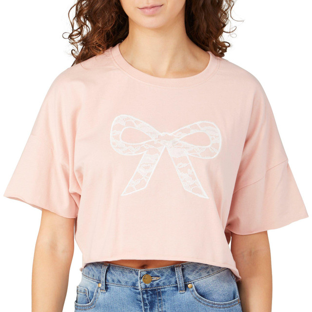 Introducing the Juniors Lace Bow Crop Top, crafted from a blend of cotton and spandex for a comfortable and stretchy fit. This stylish top features a delicate lace bow design on the front, adding a touch of elegance and charm. The short sleeves and round neckline offer a classic look, while the cropped length adds a trendy twist. Perfect for any casual outing, this crop top combines fashion and comfort seamlessly.