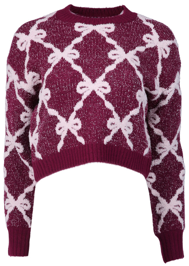 This juniors long sleeve pullover sweater features a jacquard design with allover bows. Soft and cozy, it brings playful charm and comfortable style to any cool weather outfit. Top measures approximately 18 in long. Fabrication is 70% polyester, 28% acrylic, and 2% spandex.