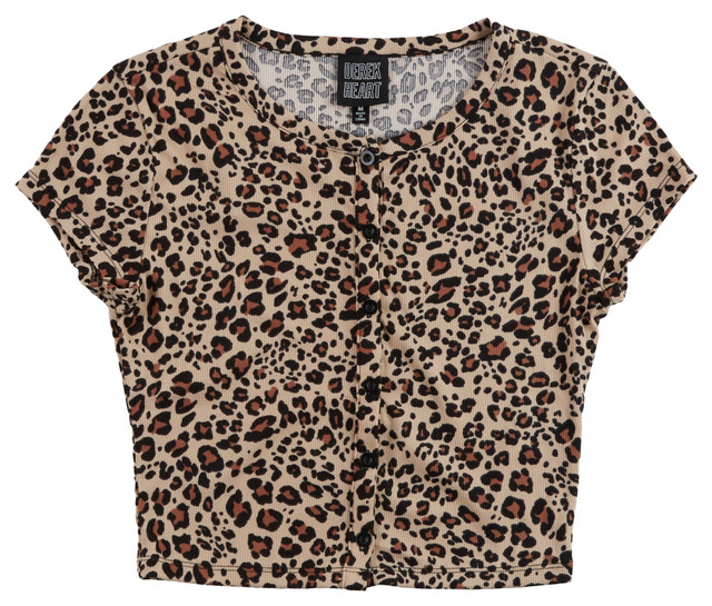 This junior short sleeve top features a leopard print, button down design, and soft ribbed fabric. It combines stylish flair with comfortable everyday wear for a playful, trendy look. Fabrication is 92% polyester and 8% spandex.
