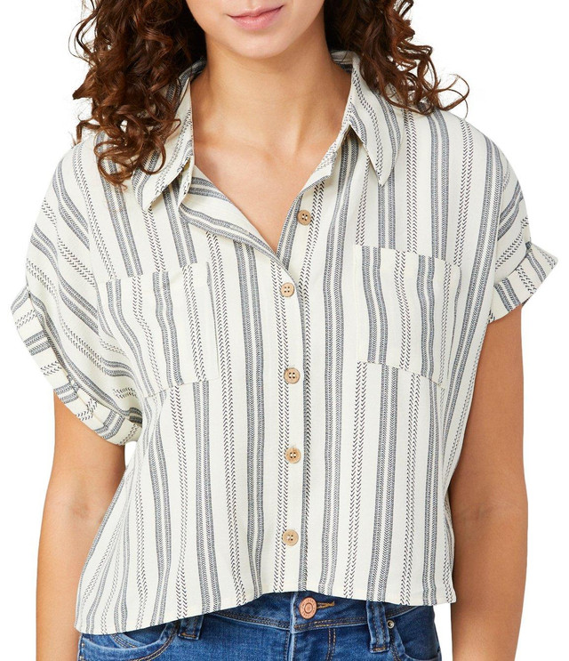 Add another instant classic to your wardrobe with this short sleeve top by Derek Heart! It features a classic button down front with a striped print and a cropped design. Combining comfort and style effortlessly, this top is a versatile addition to any junior's wardrobe. Fabrication is 100% recycled polyester. Top length measures approximately 19 in.