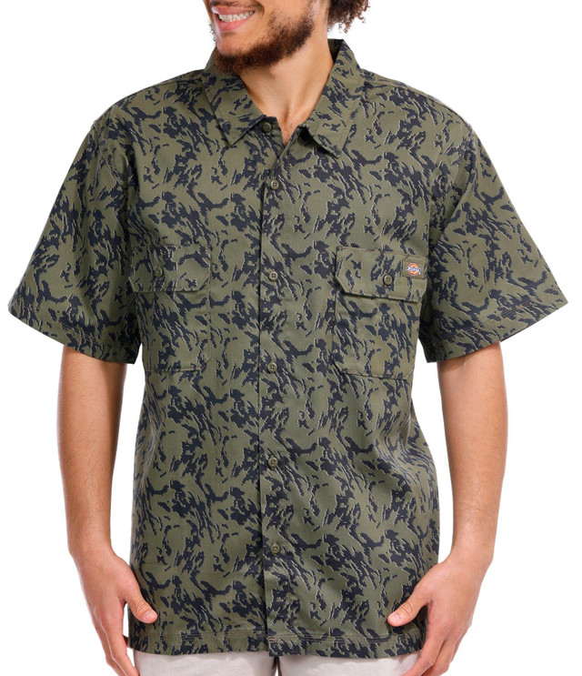 Introducing the Big Men's Drewsey Camo Work Shirt, crafted from a durable blend of cotton and polyester. This rugged shirt features a stylish camo print, a button-down front, a collared neckline, and practical chest pockets. Perfect for both work and casual wear, this shirt combines functionality with a modern, outdoorsy look. Stay comfortable and stylish on the job with this essential wardrobe piece.