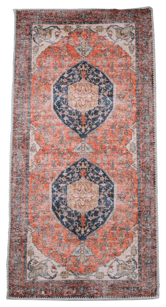 Add timeless detail to your space with the 23x47 Persian Style Accent Rug. Featuring a traditional design in rich tones of rust, black, tan and gold, it brings warmth and elegance to entryways, kitchens or bedside areas. Includes a skid resistant backing for secure placement. Machine washable in cold water. Measures approximately 23 in x 47 in.