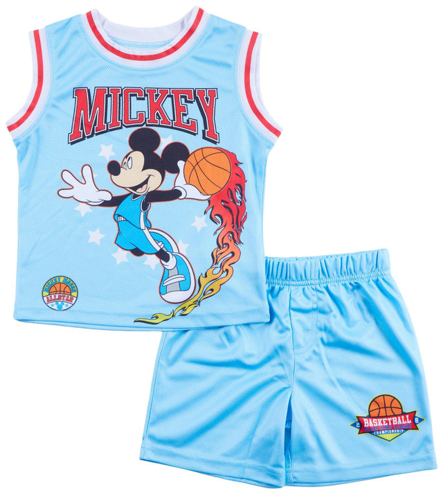 Give his style a slam dunk with this Disney Mickey Mouse Basketball Set! Featuring a sporty jersey with bold graphic appliqué and ribbed trim, plus matching shorts with an easy pull-on waistbandit's a winning combo for playtime and beyond. 100 % Polyester