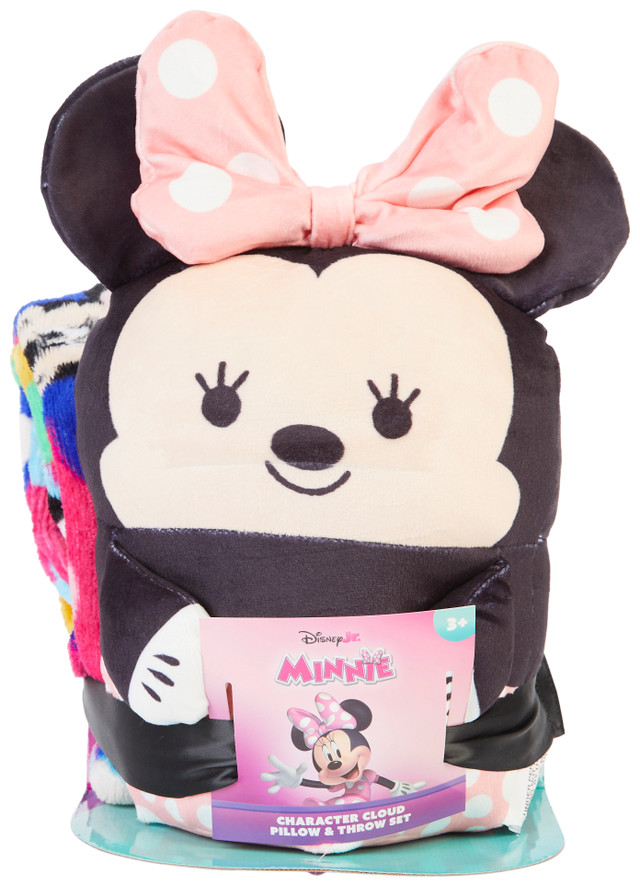 This Minnie Mouse kids cloud pillow and throw set brings comfort and cheer. It features a happy character pillow and a soft matching blanket that is machine washable, perfect for cozying up at home or on the go. Blanket measures 40 in x 50 in. Pillow shell fabrication is 94% polyester and 6% spandex, pillow fill fabrication is 100% polyester. Blanket fabrication is 100% fabrication.