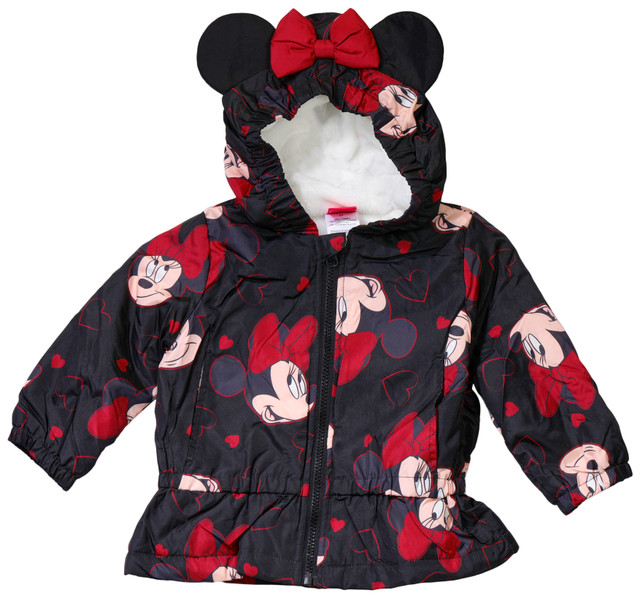 Keep her cozy and cute with the Toddler Girls Minnie Mouse Fleece Lined Jacket, featuring a soft fleece lining, hood with mouse ears and red bow, long sleeves, and a playful Minnie Mouse print. The full zip front and slash pockets make it easy to wear, perfect for chilly days and active play. Fabrication is 100% polyester.