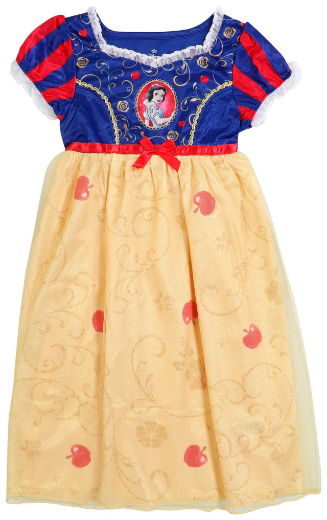 She will look fabulous in this Snow White themed dress! This dress features flutter mesh sleeves on lightweight satin and tulle fabric, an attached tutu tulle skirt styling, 1/2 slip skirt lining, colorful tulle, pink fitted elastic waistline, and a high neckline with princesses screen print design.