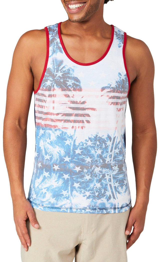 Show your patriotic spirit with our Men's Blue American Flag Tank Top. Made from a blend of cotton and polyester, this tank features an American flag print and a palm tree print, complemented by a stylish u-neckline. Perfect for warm weather and casual outings.