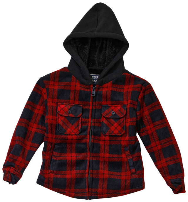 Keep your little one warm and stylish with the Toddler Boys Polar Plaid Flannel Hooded Jacket. Featuring a dark red plaid modern design, soft 100% polyester flannel, and plush faux fur lining, it offers a cozy hood, zippered front, and two front slash pockets for everyday comfort. Perfect for chilly days and casual outings. Machine washable and safe for tumble drying. Fabrication is 100% polyester.