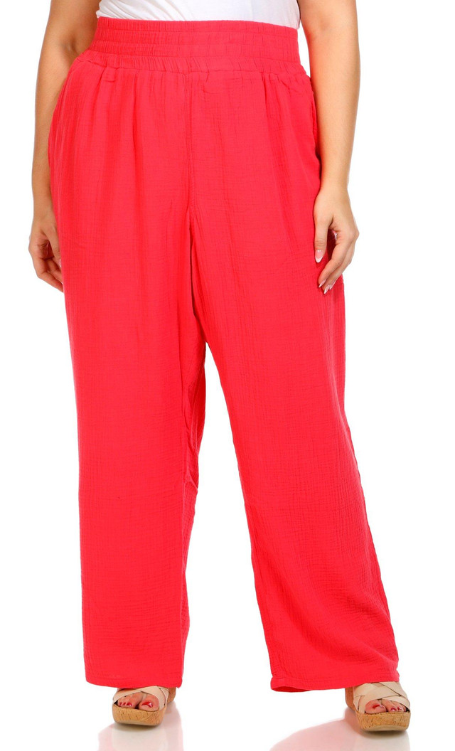 These plus size gauze pants feature a solid color with a 29 inch inseam, elastic waistband, and side seam pockets. With a straight leg fit and lightweight feel, they are perfect for relaxed days and casual comfort. Fabrication 100% cotton