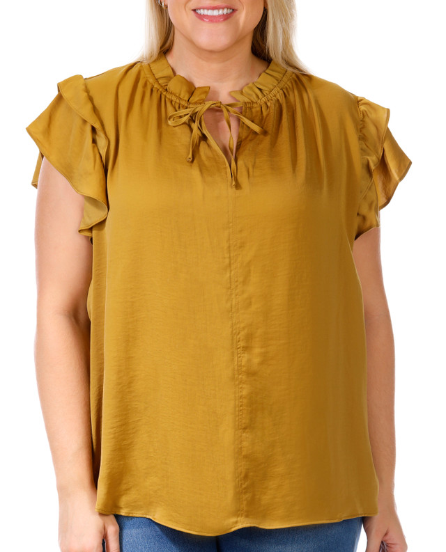 This plus size short sleeve dressy top features a silky fabric, a split neck with tie, and fluttery sleeves. Elegant and comfortable, it adds polished style to work, special occasions, or dressy everyday looks. Top measures approximately 26.5 in long. Fabrication is 100% polyester.