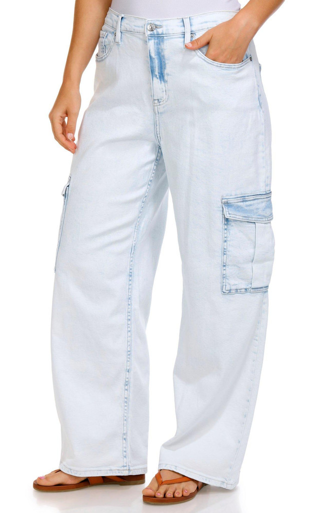 Step up your denim game with the Women's High Rise Wide Leg Cargo Jeans. Made from a comfy cotton-spandex blend, these jeans feature a flattering high-rise waist, roomy wide-leg fit, classic 5-pocket styling, and extra cargo pockets for utility-chic flair. Finished with a button-fly zip closure for a timeless touch.