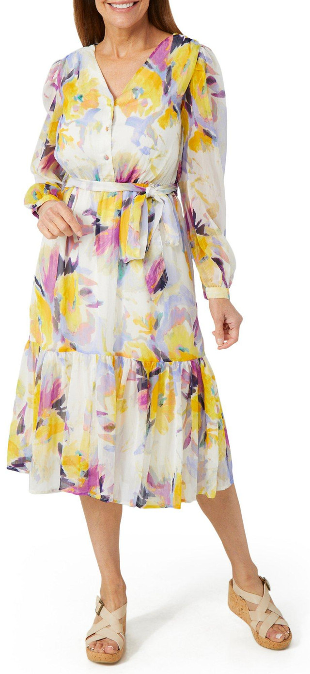 This maxi dress is made of 100% polyester and features a soft watercolor print with long sleeves, a quarter button down v-neckline, and a waist tie. Flowing and graceful, it is ideal for both casual and special occasions.